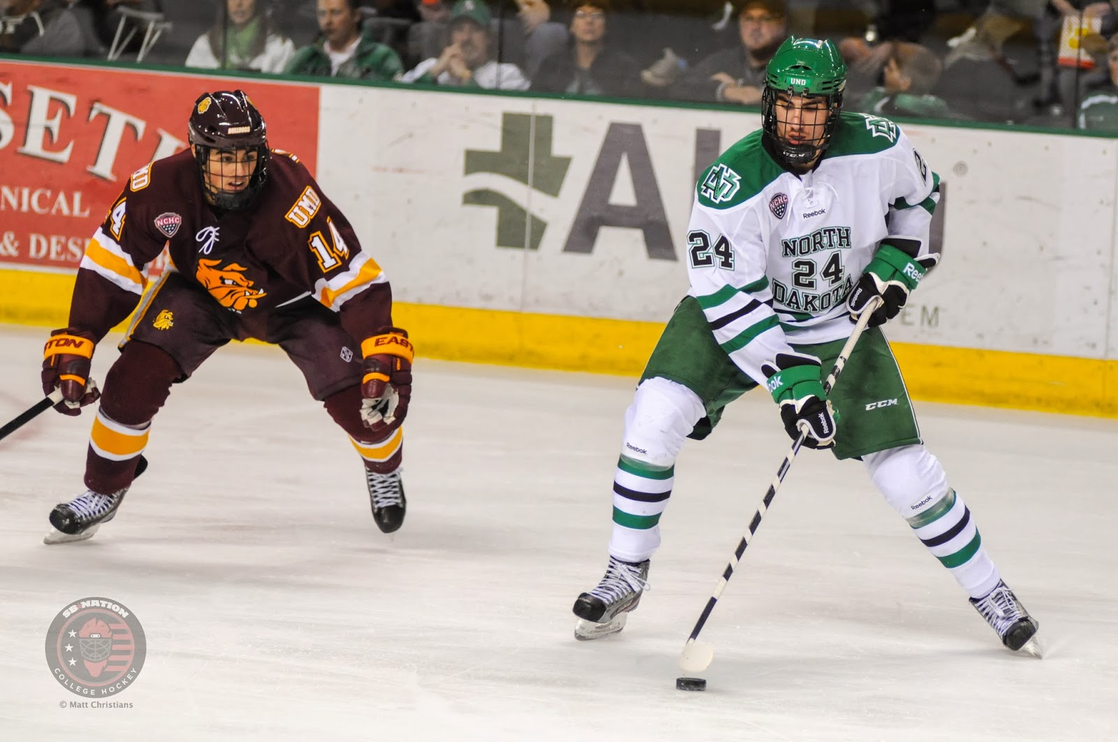 North Dakota Downs Duluth 4-2The University of Minnesota Duluth Bulldogs were beat by North Dakota by a score of 4-2 on Friday night at the Ralph Engelstad Arena in Grand Forks, ND. First off, if you'd like to read the less-biased/colorful recap, I'd recomend clicking on my SB Nation College Hockey article. If not, keep reading. The Ralph has got to be one of the most amazing places on earth for people who love hockey. I've been to my fair share of rinks across the midwest, but nothing touches the atmosphere and history this place has. I don't care how much you may dislike the North Dakota hockey team, the rink in itself is worth the drive. Overall, the game was pretty much how I imagined it would be. Very chippy, gritty, and dirty, lots of penalties, and the occasional punches thrown. I mean it's North Dakota, the Bulldogs have played that way against this team since before I was born. There were a few things that I liked about the Bulldogs on Friday night. First off, they played a decent game of hockey. If you take back the dumb penalties this team decided to take, we probably would have won that game. Aaron Crandall played absolutely excellent. Giving up three goals on 22 shots may not sound like the most impressive night out, but keep in mind only one of those goals was an even strength goal, in which he thought he was laying on the puck, but it was laying to the right of his head. I liked how Andy Welinski played on Friday night as well. There was a stretch of 8 minutes where he alone saved roughly five solid breakaway attempts, some of which he was cleaning up someone else's mess. Kyle Osterberg is an igniter. I think most anyone else would agree with me. Heck, put him on a line with Charlie Conway and Fulton Reed and they'll score 9 times out of 8. I would also argue that most of the other team sparks off of it as well, which is awesome to see. * * * * * * * * * * For a complete summary, view my post on SB Nation -> North Dakota 4 Minnesota Duluth 2 (which also shows pictures from last night's action) Enjoy. Questions? Comments? Ask Below! Comments